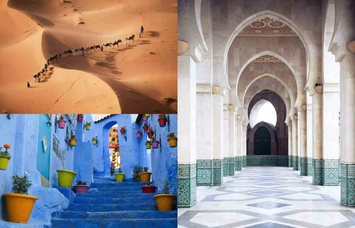 Top Left: Sahara Desert, Morocco | Bottom Left: Alleyway in Chefchaouen, Morocco Right: Mosque Hassan II, Morocco